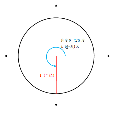 になります。それぞれの角度と半径の位置を単位円に描くと、θ=135度は第二象限、270度は第三象限、90度は第一象限にあります。下図をみてください。第三象限では高さが負の値です。単位円に270度を描くと半径(斜辺)と高さは等しくなるので「sin3π/2=高さ/斜辺=-1/1=-1」になります。